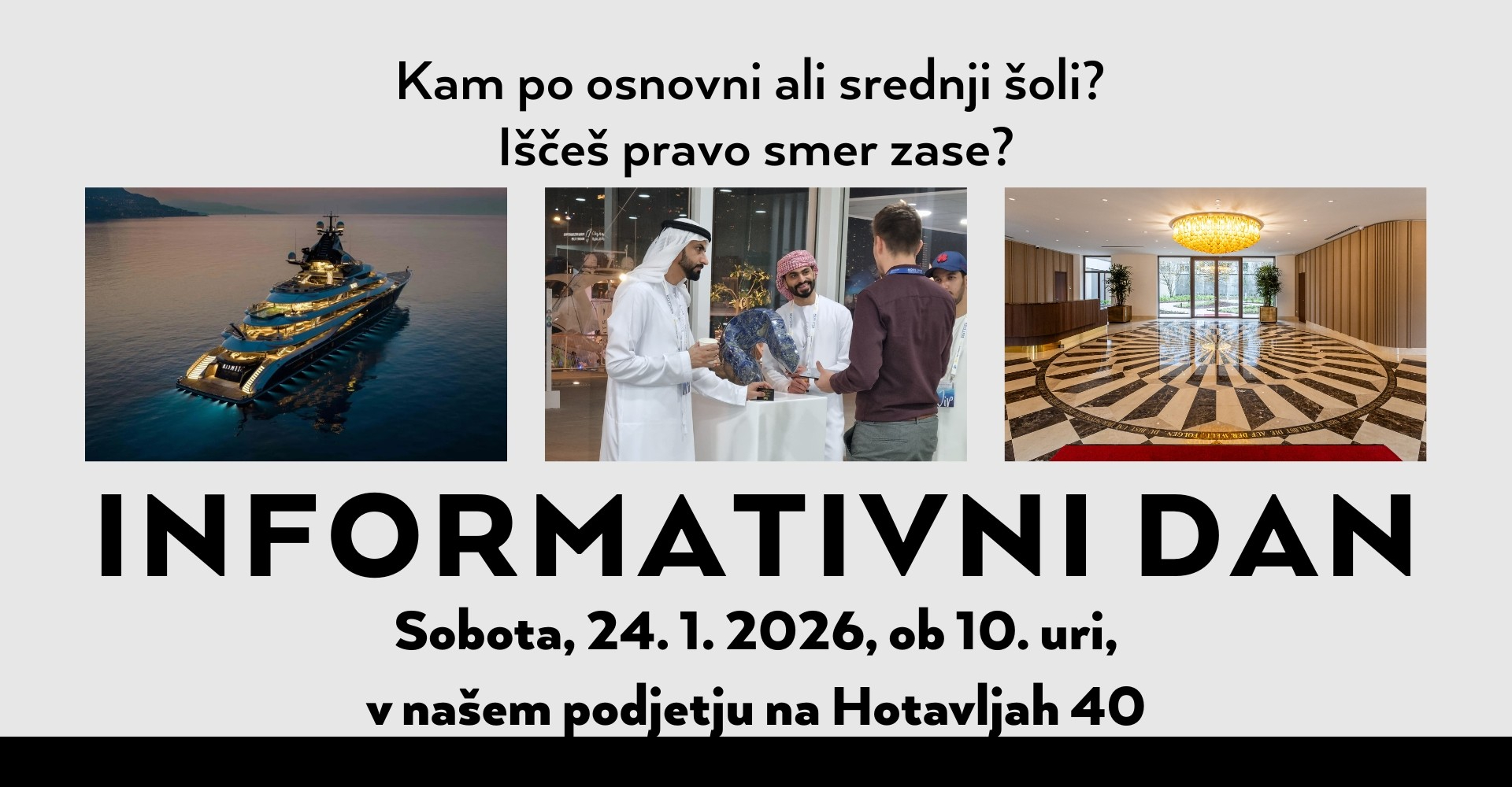 Z informativnim dnem želimo mladim ponuditi priložnost, da poklice spoznajo od blizu – v realnem delovnem okolju podjetja, ki sodeluje pri najzahtevnejših luksuznih projektih na svetu, od superjaht in vrhunskih rezidenc do pohištva in kamnitih interierjev. Takšen neposreden vpogled bo olajšal razmislek in odločitev, katera šola je prava izbira zanje.